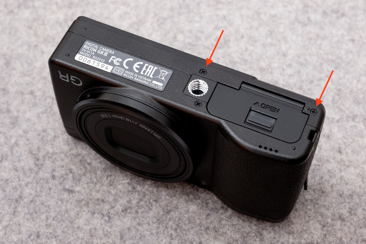 There are two screws to remove from the right side of the camera. The first is located center-top, just left of the wrist strap loop. The second is hidden behind a piece of rubber just below and slightly to the left of the first screw. Peel back the rubber piece which straddles the play/review button starting from the top right corner to reveal it. (It won’t lose its stickiness.)
